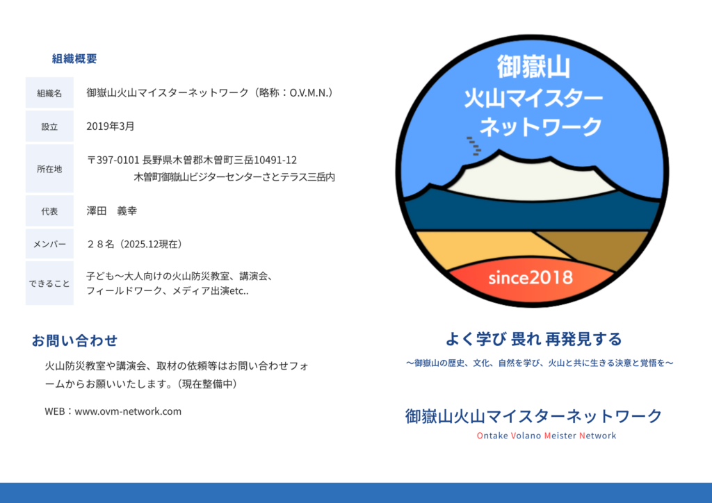 TOPPAGE 2025.12.14 ✓新着記事はこちら 火山マイスターネットワーク活動紹介⑤ 2026.01.21 マイスター活動活動紹介研修報告 令和7年度御嶽山火山マイスター認定審査事前講習会が行われました! 2026.01.13 ご案内 御嶽山火山マイスターネットワーク活動紹介④ 2025.12.27 マイスター活動活動紹介研修報告 最新記事の一覧はこちら 御嶽山火山マイスターネットワークとは? ✉お問い合わせはこちら